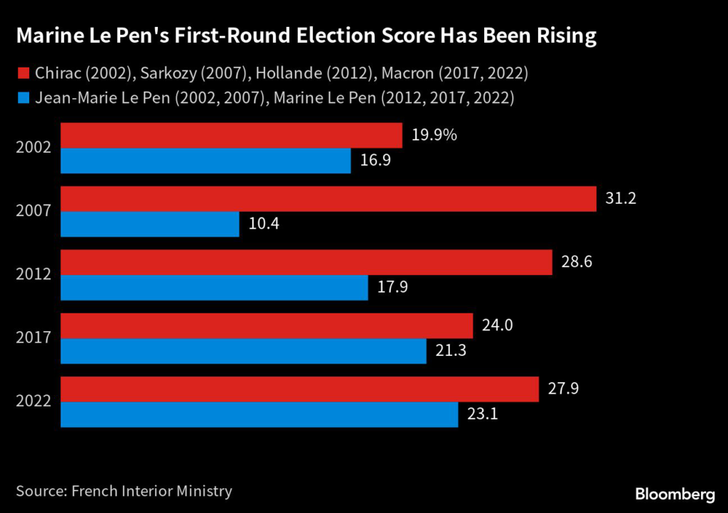 To be sure, Le Pen has established a bridgehead in French politics after twice reaching the presidential runoff against Macron, and there are signs that the anger at the president is making some people more receptive to the nationalist and others less likely to vote simply to block her.