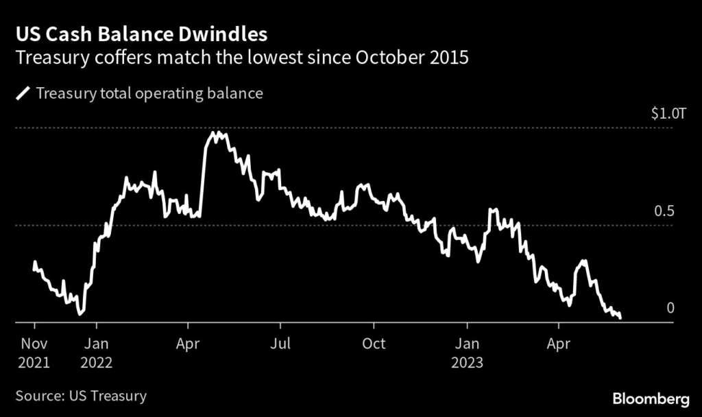 (Bloomberg) — The amount of money the US government had to pay its bills plunged to the lowest level in more than seven years, just as Congress passed legislation that suspends the statutory borrowing limit until 2025.