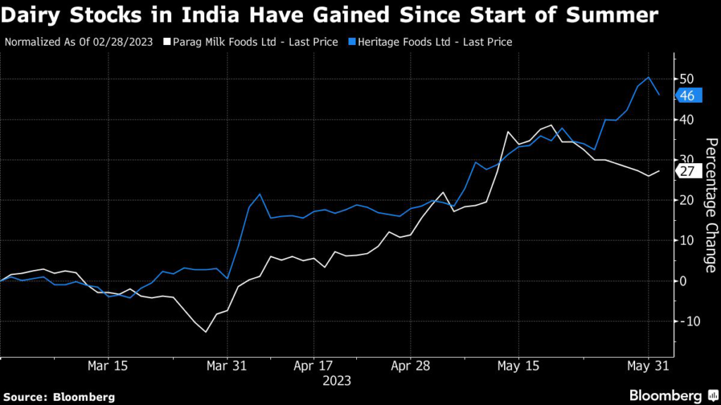With more high temperatures forecast as summer demand peaks, shares of dairy firms such as Parag Milk Foods Ltd. and Heritage Foods Ltd. are soaring.