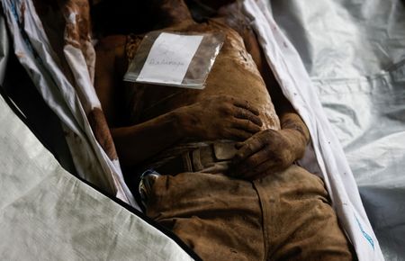 Dead bodies were lying on the bloodstained floor of a school used as a makeshift morgue, and police helped relatives identify the bodies, covered with white cloths and placed inside chained bags.