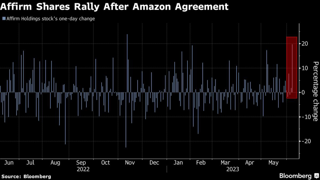 Affirm shares jumped as much as 23% Wednesday morning, to $19.50, their biggest intraday gain since early February.
