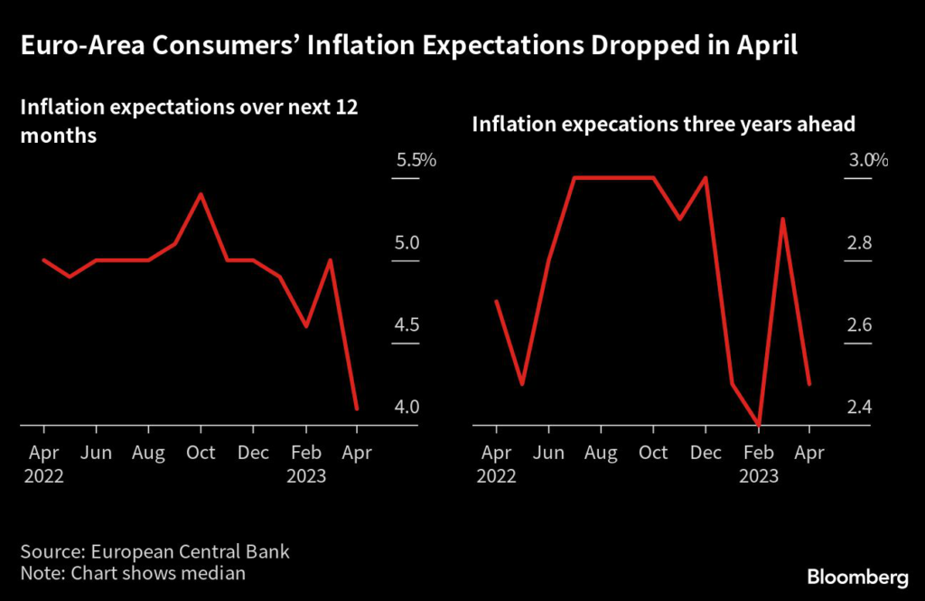 Both headline inflation and the core gauge that policymakers’ have increasingly used as their guide moderated by more than anticipated in May, while an ECB survey published Tuesday showed consumers’ expectations for the trajectory of prices easing significantly.