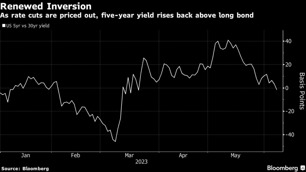 The five-year yield at one stage was back to trading nearly three basis points above the long bond, the deepest inversion since March 22, before trimming that move late in New York.