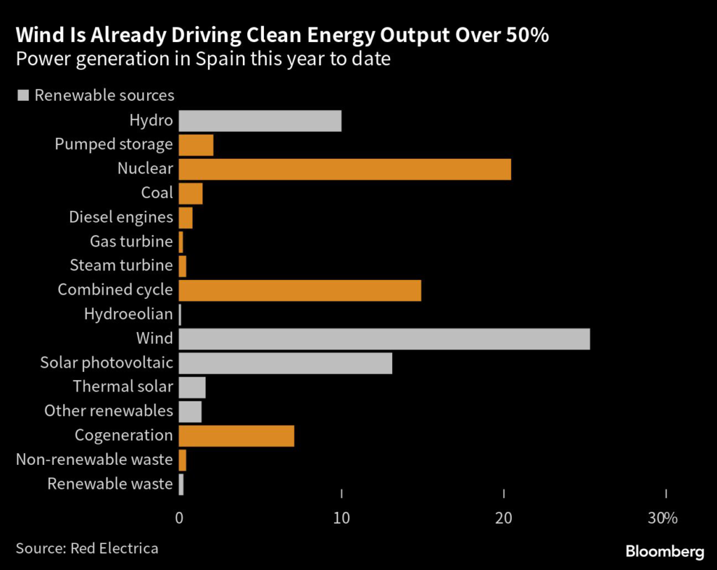 (Bloomberg) — Spain is on track to become the first country among Europe’s big five economies to generate more than 50% of its electricity from renewable sources, according to a forecast by Rystad Energy.