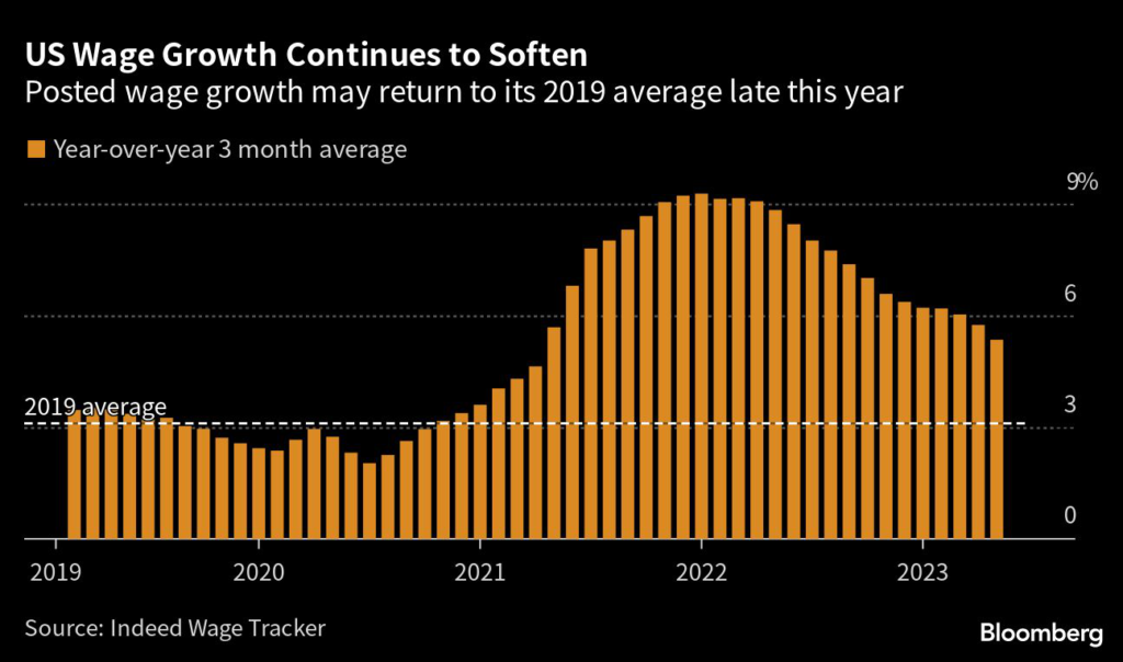 (Bloomberg) — Wage growth in US job postings has been softening for more than a year now, and at the current rate it could return to pre-pandemic levels by early 2024, according to Indeed Hiring Lab.