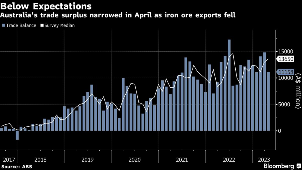 (Bloomberg) — Australia’s monthly trade surplus narrowed more than expected in April — while still remaining healthy — as exports of iron ore and other metals declined and imports advanced.