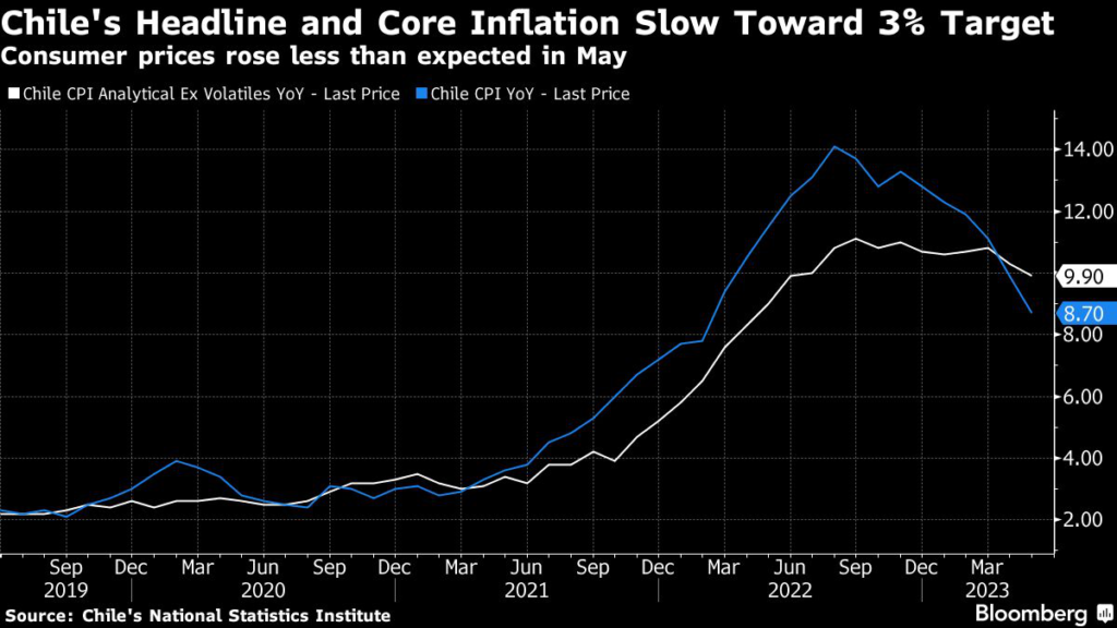 Chile’s annual inflation slowed more than forecast in May on falling transportation costs, stoking bets that the central bank will lower its interest rate from an over two-decade high as soon as next month.