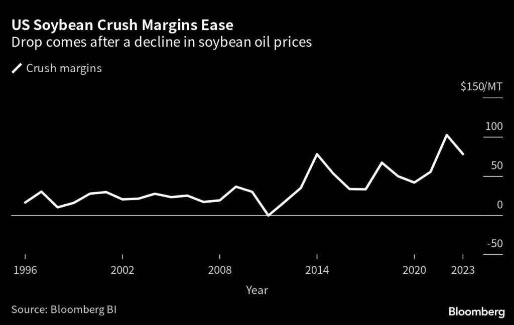Billions of dollars have also poured into oilseeds crushing. Still, some 30% of the additional 2.2 million bushels a day of soybean-processing capacity won’t be operating by 2026, industry consultant Gordon Denny said this week in a presentation to US soy buyers in Indonesia.