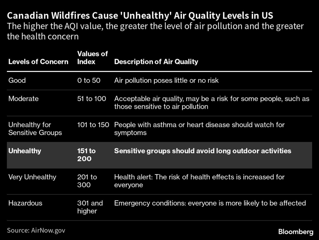(Bloomberg) — Millions of Americans woke up to apocalyptic, orange skies Wednesday as thick smoke from wildfires in Canada moved across the US Northeast, spawning air quality warnings from Massachusetts to Washington, DC.