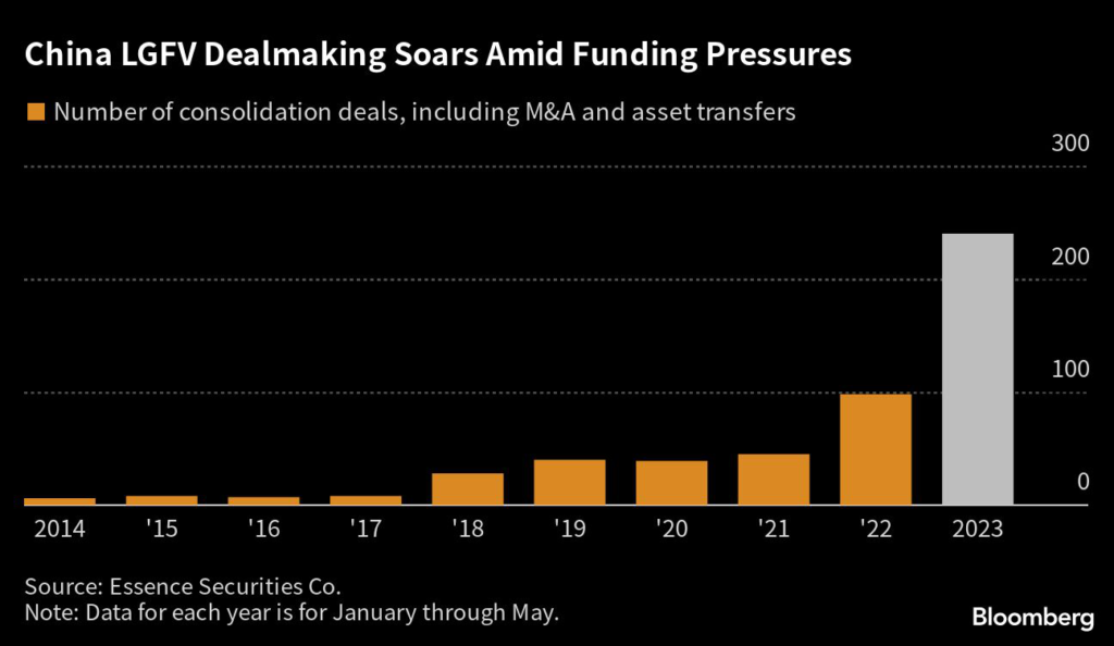 LGFVs, which mostly fund infrastructure projects, were involved in 240 deals including mergers and asset transfers between January and May, more than double on year, according to calculations based on Essence Securities Co.’s LGFV consolidation monthly report.