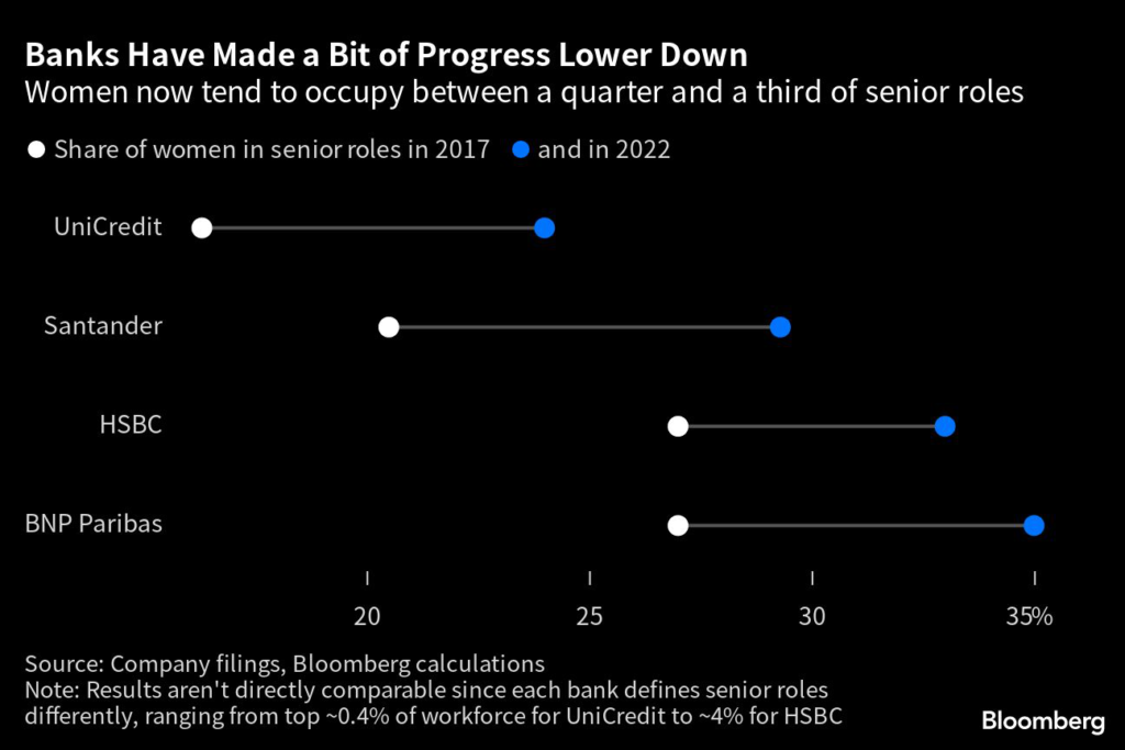 For example, the share of women in senior management positions at BNP Paribas SA — a group comprising roughly 2% of the top roles — has risen 8 percentage points over the past five years to 35%, and the aim is to hit 40% by 2025.