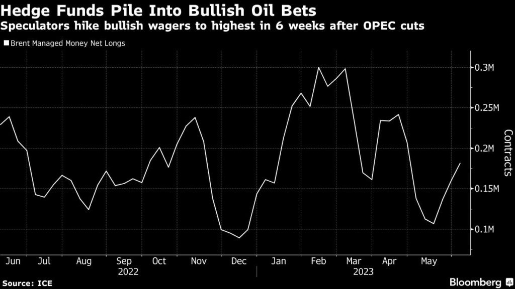 Hedge funds boosted bullish bets on Brent and WTI crude in the week ended June 6, with long positions on the global benchmark reaching a six-week high.