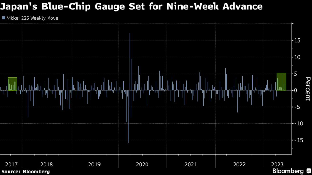 (Bloomberg) — Japan’s blue-chip equity gauge is set to complete a nine-week advance that would be its longest winning streak in more than five years.