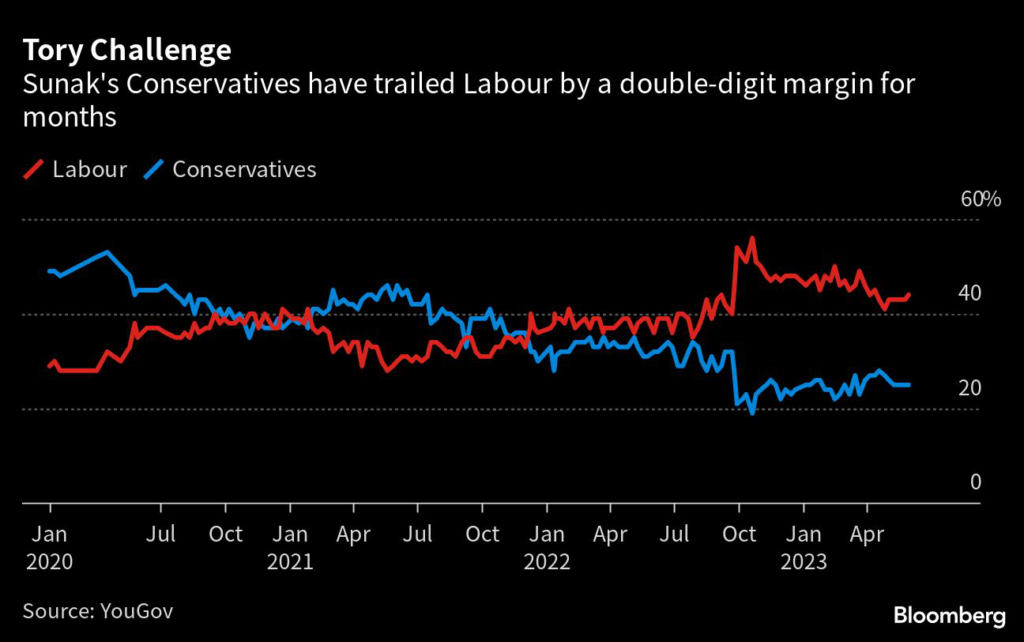 (Bloomberg) — Prime Minister Rishi Sunak faces a new electoral challenge after Boris Johnson’s surprise resignation from Parliament triggered at least three by-elections that could highlight softening support for the Conservative Party.