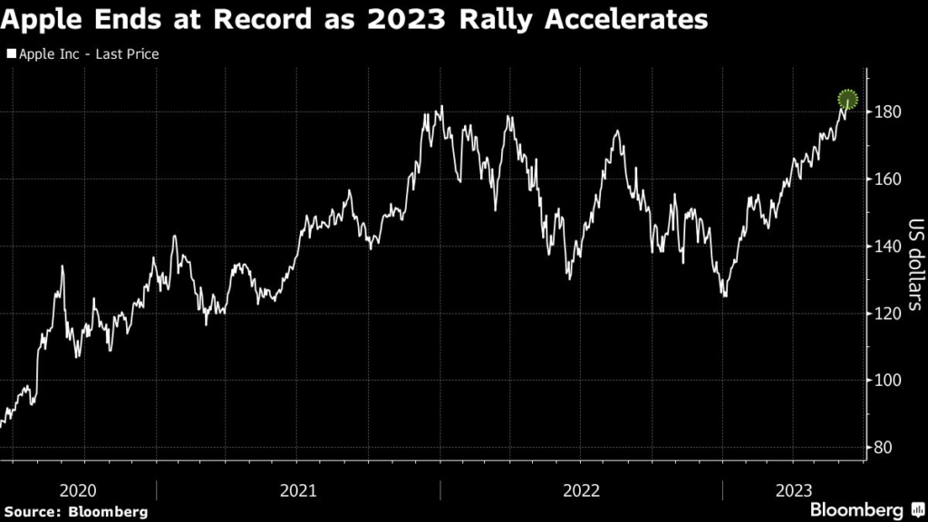 The day’s gain brings Apple’s 2023 advance above 41%, compared with the 35% gain of the Nasdaq 100 Index.