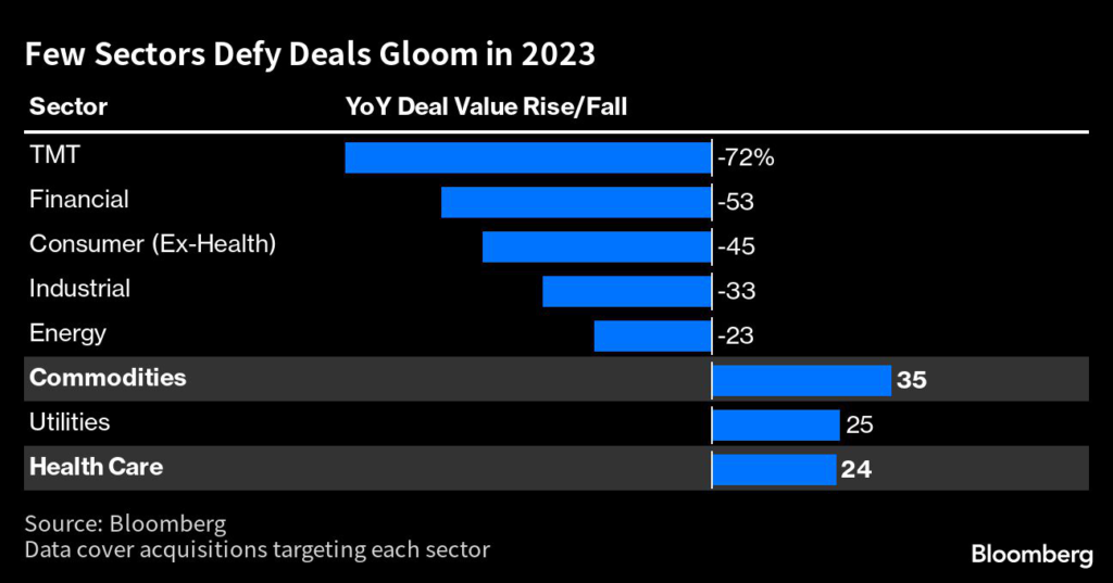 One of them is health care, with acquisitions targeting the sector up 24% to $157 billion, data compiled by Bloomberg show.