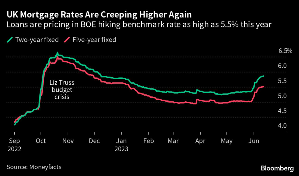 The average two-year fixed-rate home loan surged to 5.86% on Monday, according to Moneyfacts Group Plc.