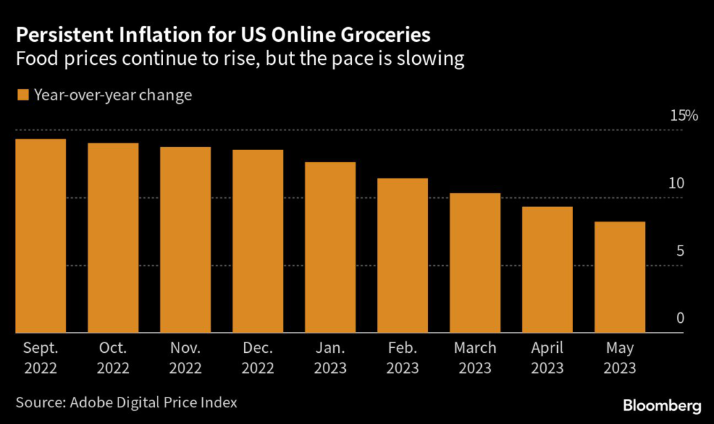 (Bloomberg) — Shopping online is a good place to find cheaper computers and appliances, but grocery prices are still rising at a fast clip.