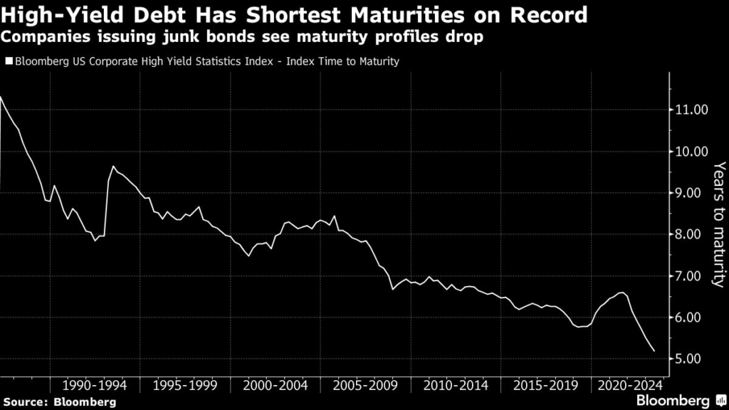 (Bloomberg) — US junk bonds have the shortest average time to maturity on record, signaling that companies will have large amounts of debt to refinance in the next few years.