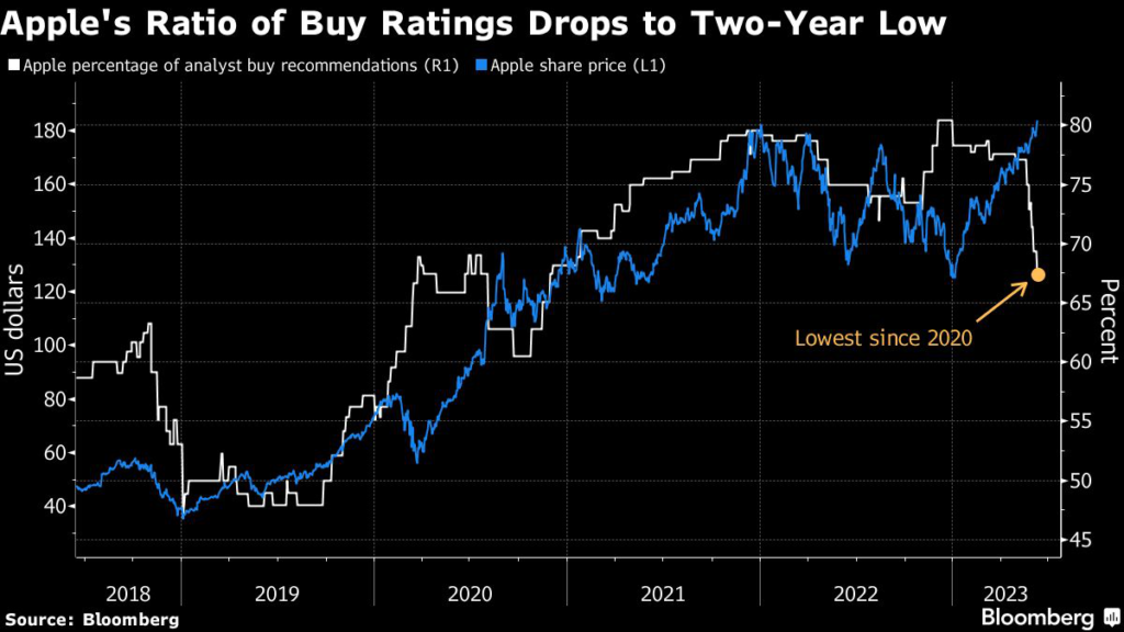That leaves Apple with buy ratings from 67% of the analysts who follow the company, the lowest since late 2020 and the worst among megacap peers, according to data compiled by Bloomberg.
