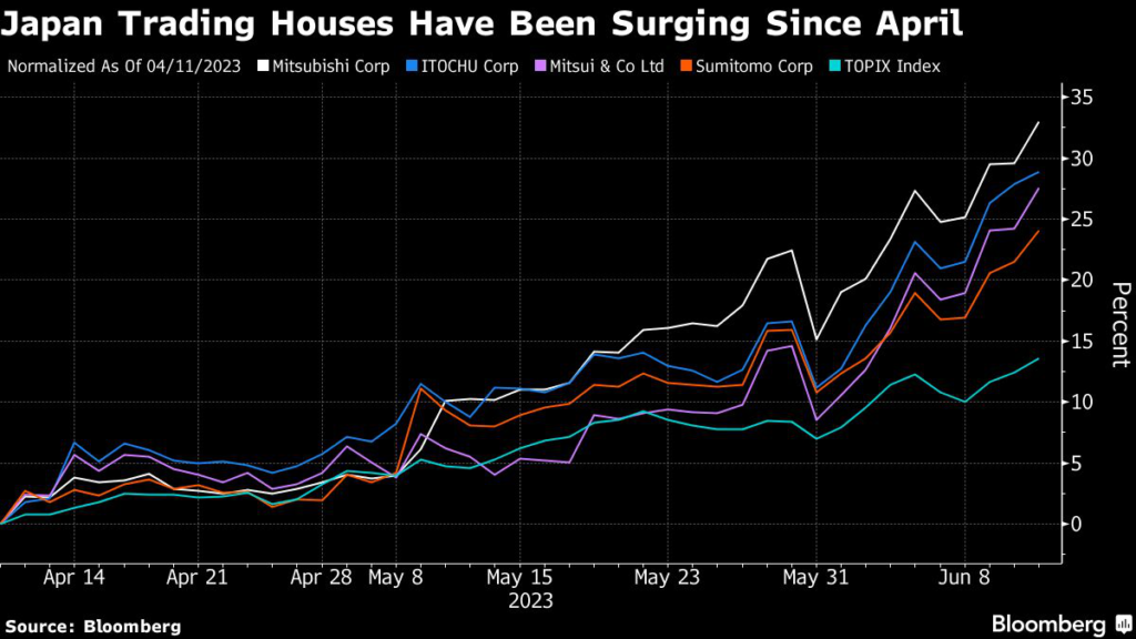 The trading houses have been renewing record highs since Buffett said in April that he’s raised his holdings in them and is looking to increase his exposure to stocks in Japan.
