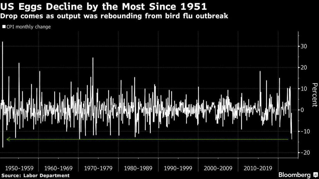 (Bloomberg) — Egg prices tumbled in May by the most since 1951 as US output continued to rebound from the worst-ever outbreak of avian influenza that killed millions of birds.