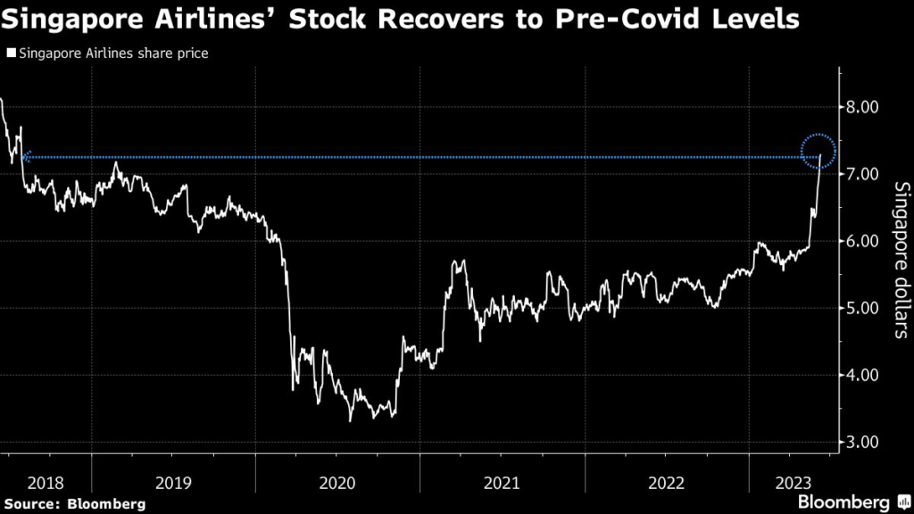 (Bloomberg) — Singapore Airlines Ltd.’s 32% rally in the past three months tops gains among global airline stocks after it posted record profit, driven by pent-up demand.