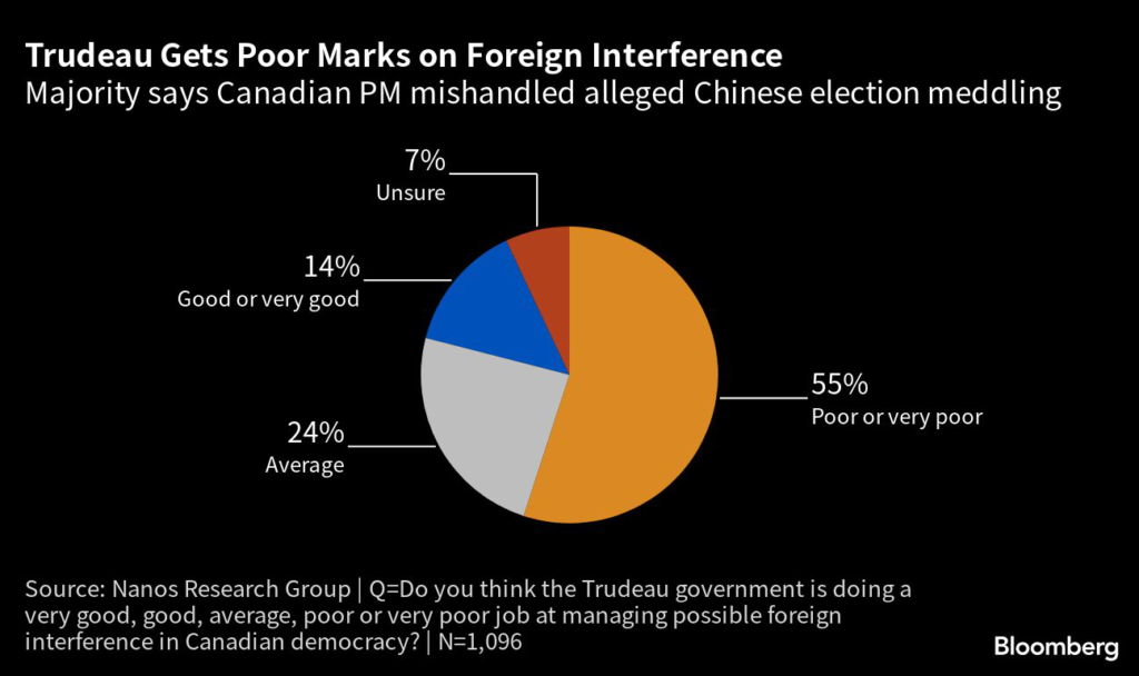 (Bloomberg) — Most Canadians believe Prime Minister Justin Trudeau has botched responding to allegations of Chinese interference in his country’s elections, a new poll suggests.