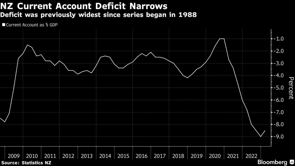 (Bloomberg) — New Zealand’s annual current account deficit unexpectedly narrowed in the first quarter as the return of tourists and international students following the pandemic boosted services exports.