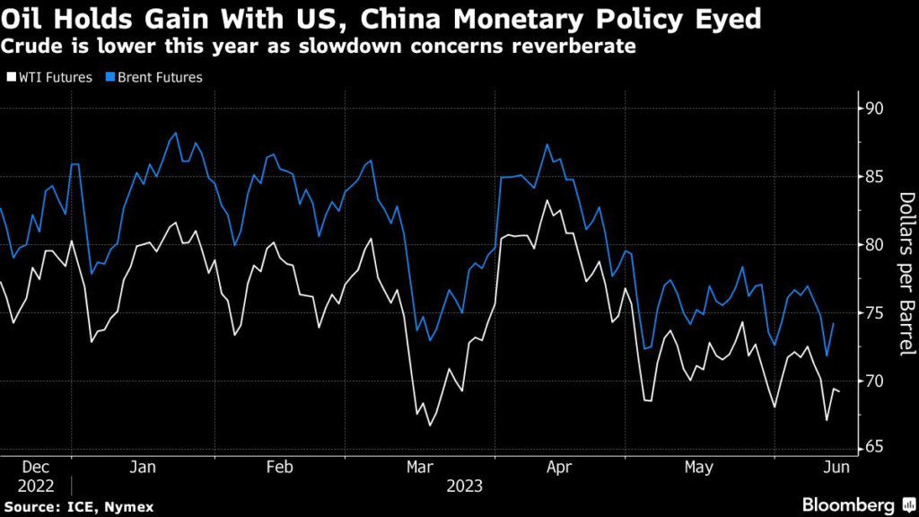 (Bloomberg) — Oil dropped as a massive increase in US crude stockpiles and the Federal Reserve’s hints that rate hikes will continue crushed the risk-on sentiment that prevailed earlier in the day.