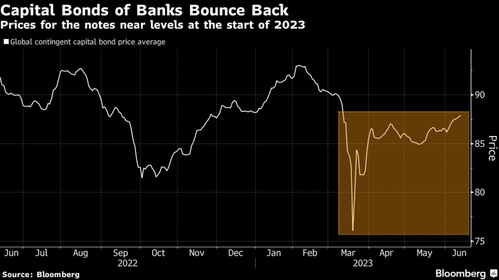 Prices of such capital securities, including the riskiest Additional Tier 1 notes, climbed on Tuesday to their highest since Silicon Valley Bank’s collapse on March 10, a Bloomberg index shows.