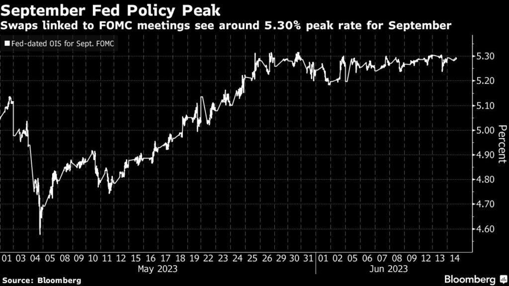 (Bloomberg) — Traders are continuing to tweak their expectations for US interest rates as the Federal Reserve meets and have now begun to anticipate the central bank’s policy rate peaking in September rather than July.