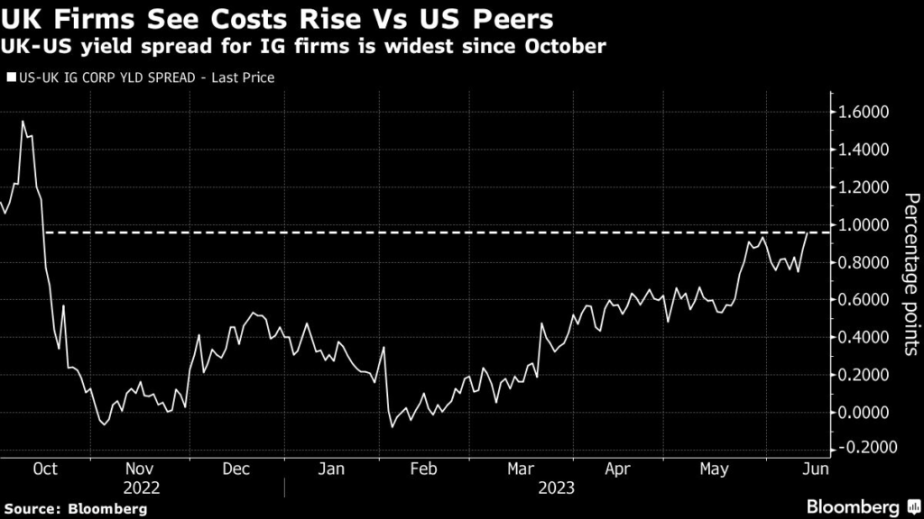 (Bloomberg) — The cost of money for UK companies is rapidly rising compared with firms across the Atlantic.