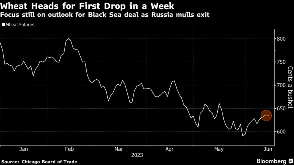 Wheat is heading for its first decline in a week as Russia’s rising pace of exports muted supply concerns amid Putin’s latest threat to scuttle the Black Sea grain-export deal.