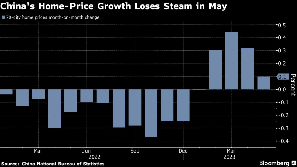(Bloomberg) — China’s home prices grew at the slowest pace in four months in May, underscoring the challenges the market is facing as economic growth loses momentum.