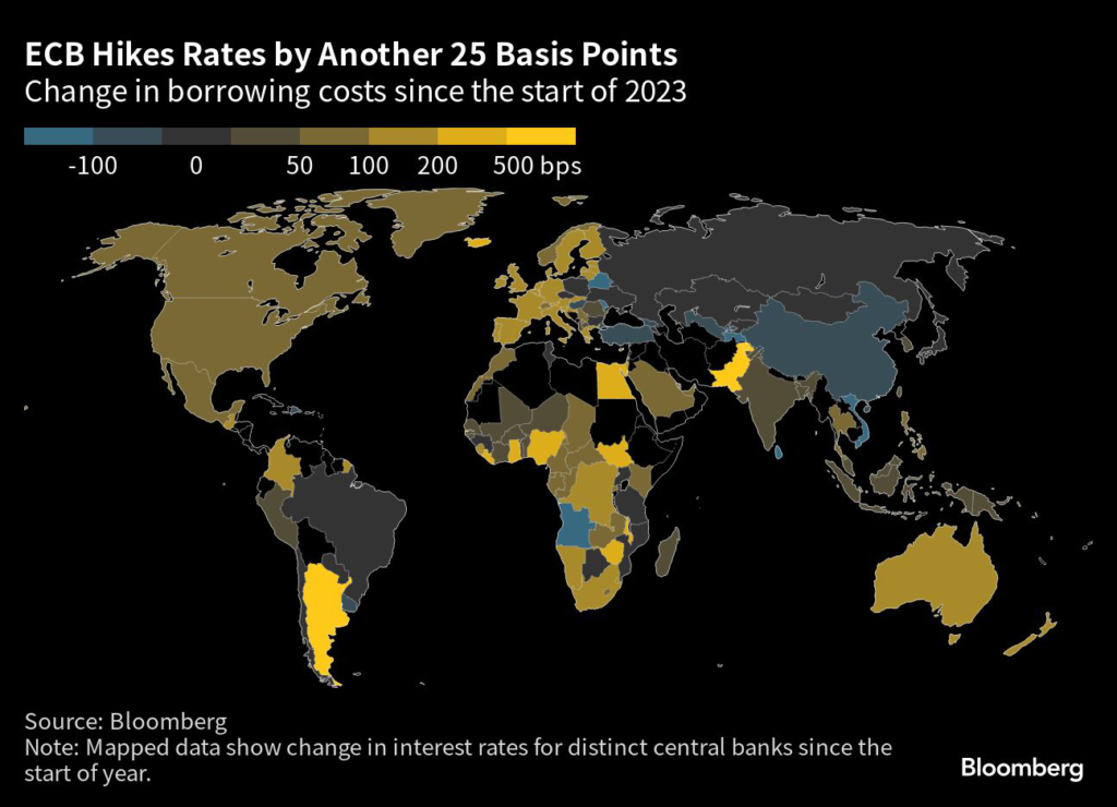 (Bloomberg) — The European Central Bank lifted interest rates by another quarter-point, with President Christine Lagarde describing a further hike in July as “very likely.”