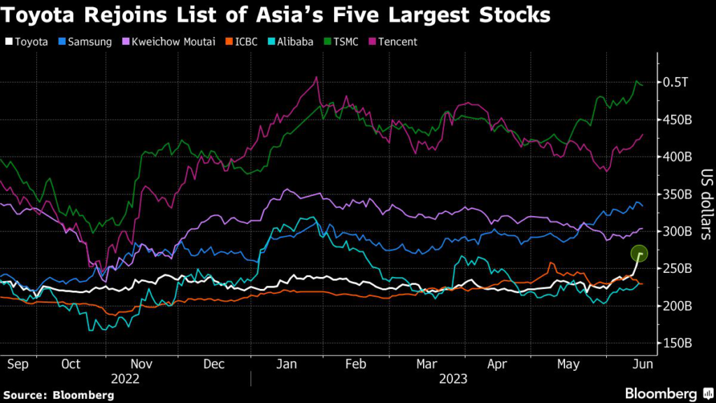 (Bloomberg) — Toyota Motor Corp.’s sizzling rally this week has propelled it back into the list of Asia’s five-largest companies by market value, charging ahead of Alibaba Group Holding Ltd.