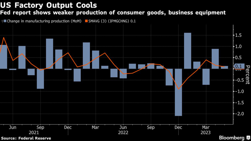 (Bloomberg) — US factory production remained sluggish in May, suggesting manufacturers are growing cautious in the face of tepid global demand and equipment spending.