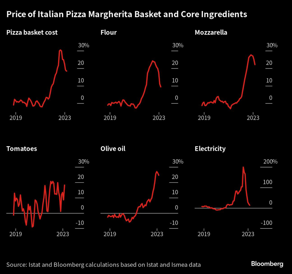 Bloomberg’s Pizza index crunches data on flour, tomatoes, mozzarella, olive oil and the electricity consumption needed to power an oven.