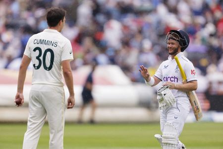 BIRMINGHAM, England (Reuters) -England were shell-shocked after losing two wickets in three overs as Australia took advantage of favourable conditions in a brief restart between rain delays to wrest back the momentum in the series-opening Ashes test at Edgbaston on Sunday.