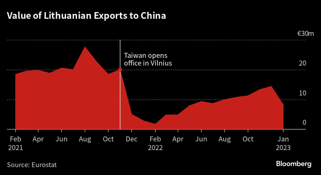 The tool gained prominence after China penalized Lithuania for opening a de-facto Taiwan mission in its capital, Vilnius. Lithuanian exports to China fell by 75% last year after China downgraded diplomatic ties and restricted Lithuanian trade.