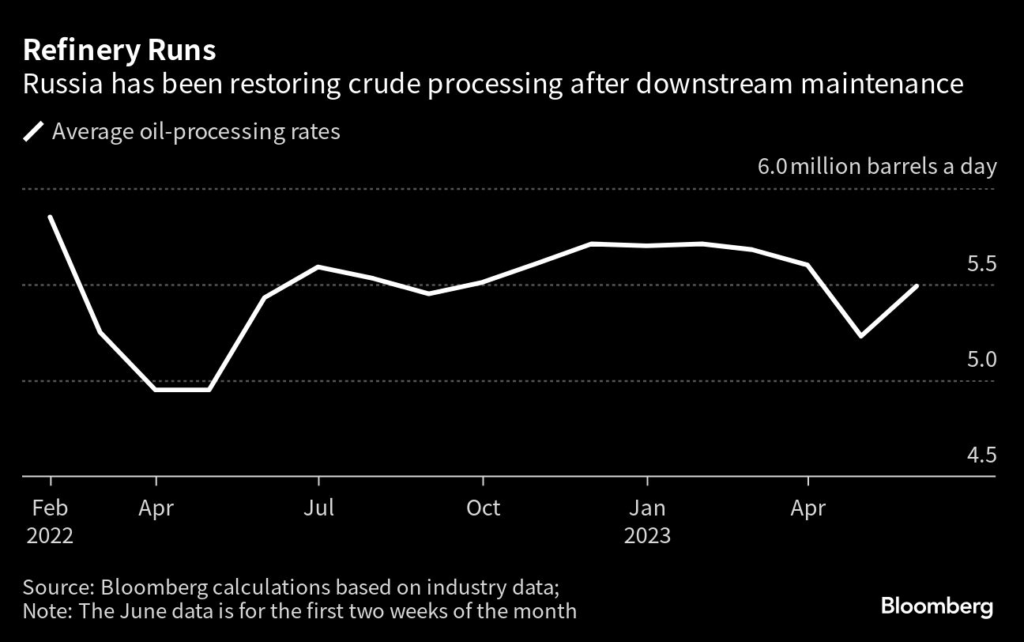 Russia’s refining facilities processed 5.49 million barrels a day in the week ending June 14, according to a person familiar with the matter.