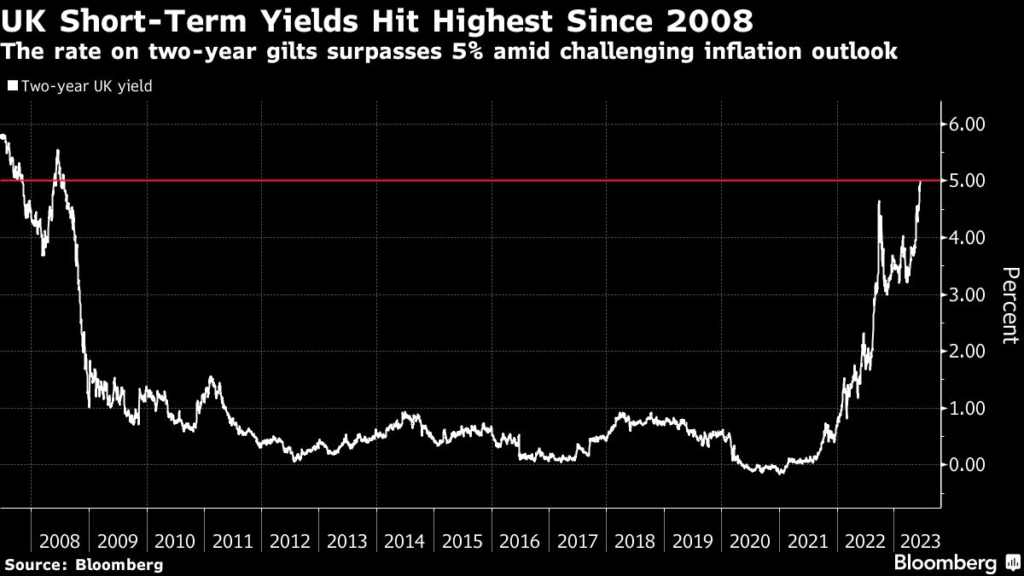 (Bloomberg) — The UK’s short-term government borrowing costs climbed to 5% for the first time since the global financial crisis amid concern the troubling inflation outlook could lead to more aggressive monetary tightening from policymakers.