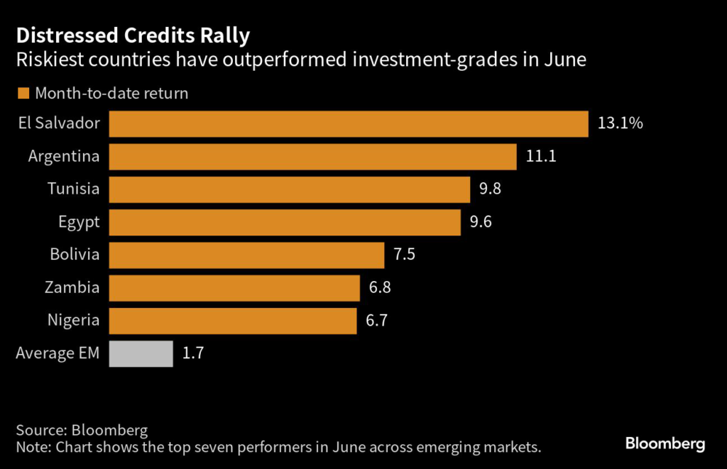 High-yielding debt from emerging markets has returned almost 3% in June so far, with the biggest gains coming from deeply-speculative CCC rated countries. Investment-grade nations, meanwhile, are little changed this month.