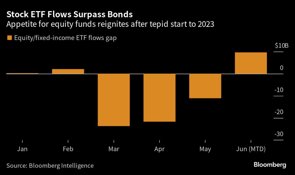 After a tepid start to 2023, nearly $102 billion has flowed into equity exchange-traded funds so far this year, according to data compiled by Bloomberg.
