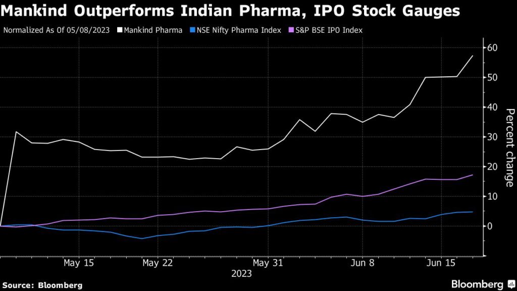 The shares are trading at about 54 times trailing 12-month earnings, compared with 31 times for India’s benchmark pharmaceutical index. Mankind’s stock jumped almost 32% in its debut.