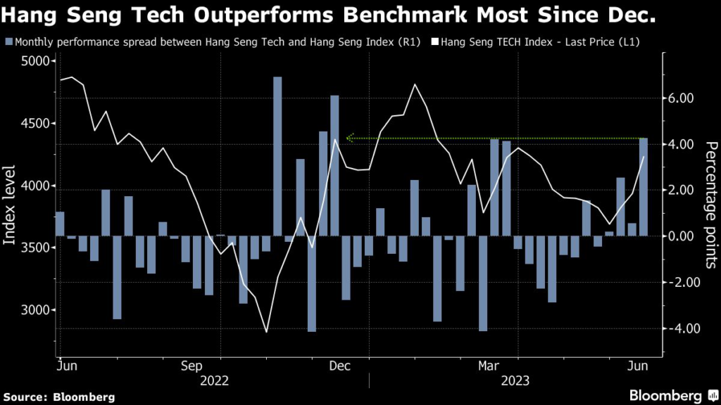 The Nasdaq Golden Dragon China Index has beaten the broader Nasdaq Composite Index market for three consecutive weeks, the first time that’s happened since January. Month-to-date, both the Hang Seng Tech and Nasdaq Golden Dragon gauges are up at least 15%, beating the majority of equity indexes tracked by Bloomberg.