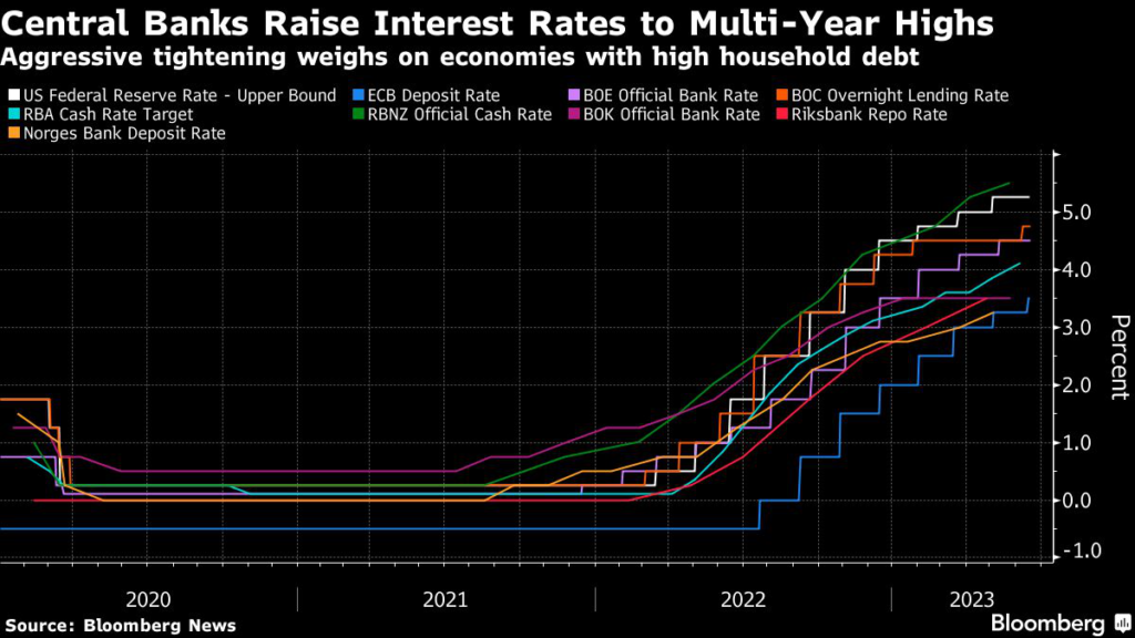 Investors holding those bets argue that these economies are way more exposed to higher interest rates than the US due to their more elevated household debt levels, and the full effect of their tightening cycles is yet to kick in.