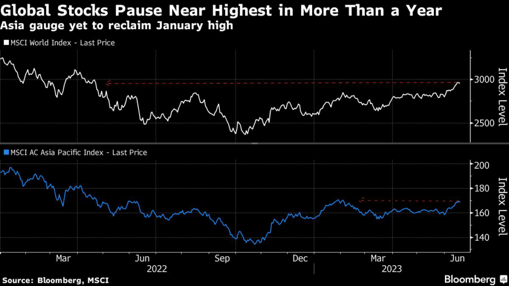 (Bloomberg) — Stocks slid on Tuesday as the second-quarter rally met resistance from economic headwinds and signs of stretched positioning.