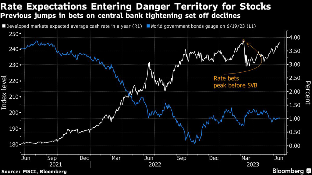 Traders are betting the average central bank rate in developed markets will rise to 3.82% in a year, the highest forecast since early March. That means they have effectively priced out bets the financial-market stress that erupted with the collapse of Silicon Valley Bank will persuade policymakers to stop tightening.